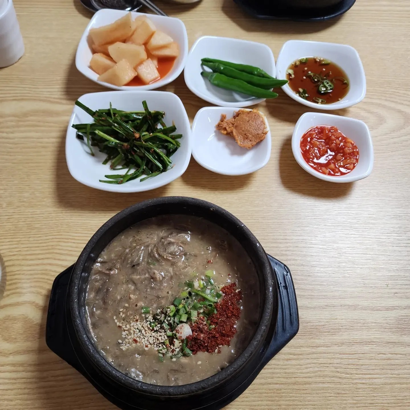 뚝배기에 담겨 파와 고춧가루가 올려져 나오고, 밑반찬으로 오징어젓갈, 부추무침, 깍두기까지 곁들여져 한 끼가 든든합니다.